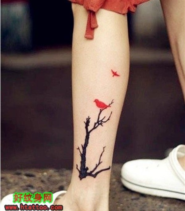 女生脚臂彩色树+小鸟唯美意境纹身_腿部纹身图案大全_纹身图吧