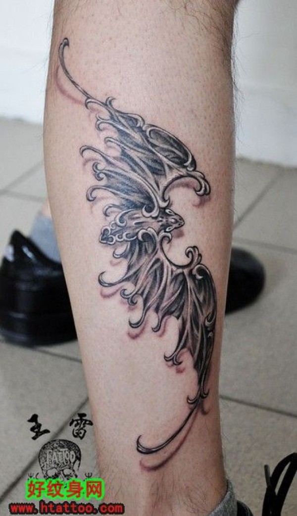 腿上展翅腾飞的黑色蝙蝠纹身_腿部纹身图案大全_纹身图吧