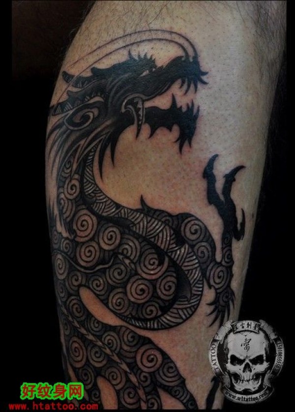 一个小腿上的黑色龙图腾纹身,做的很仔细_腿部纹身图案大全_纹身图吧