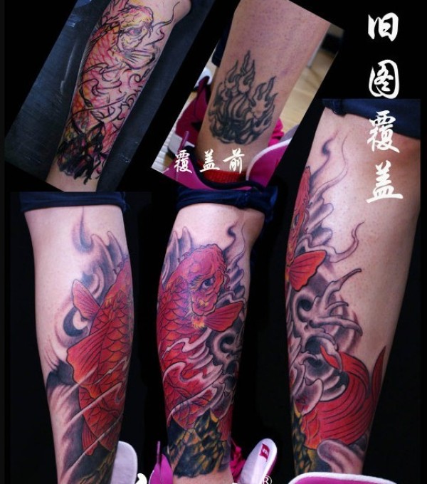 腿上的红色鲤鱼遮盖纹身图案,千贺宗作品_腿部纹身图案大全_纹身图吧