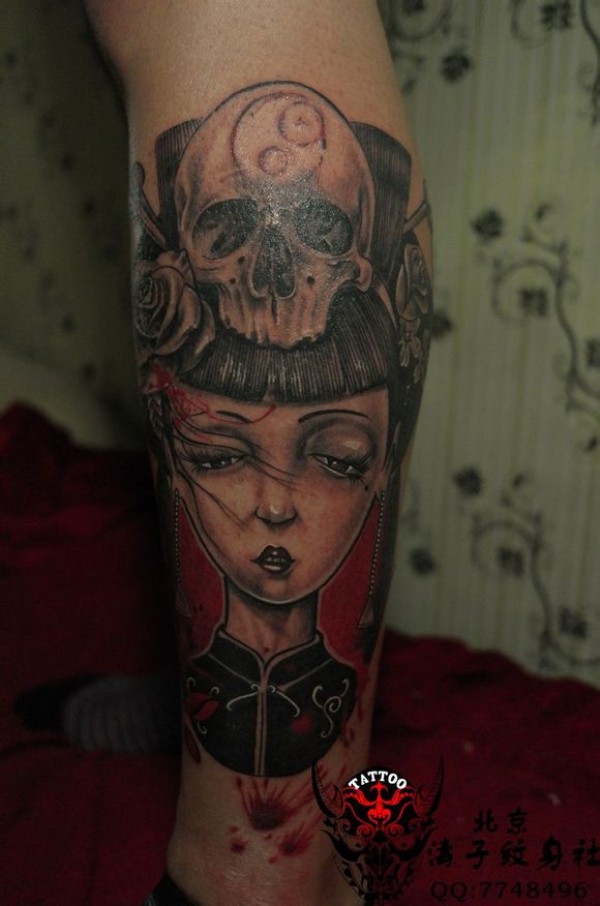 腿部纹身日本艺伎带了个骷髅帽子_腿部纹身图案大全_纹身图吧