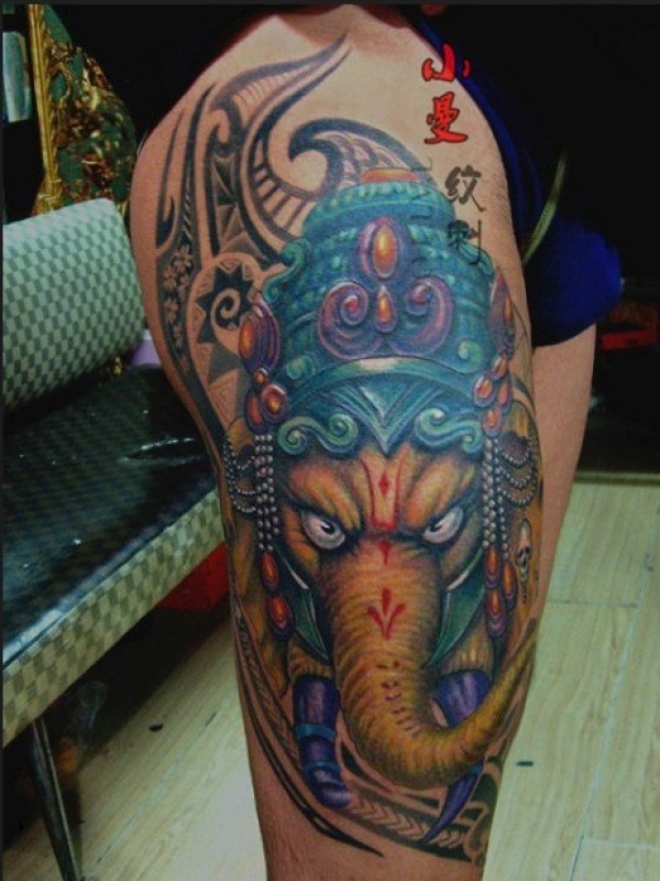 彩色的象神纹身栩栩如生_腿部纹身图案大全_纹身图吧