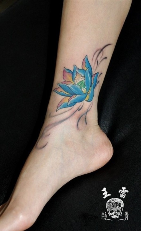 腿部蛇彩色莲花纹身图案_腿部纹身图案大全_纹身图吧