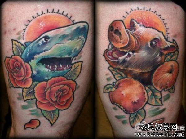 腿部潮流经典的鲨鱼野猪纹身图案_腿部纹身图案大全_纹身图吧