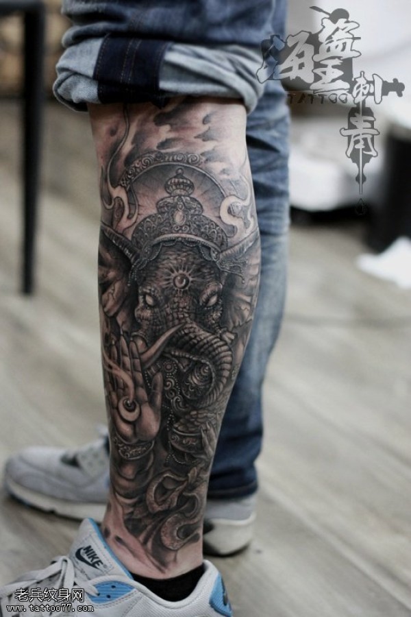 腿部象神纹身图案_腿部纹身图案大全_纹身图吧