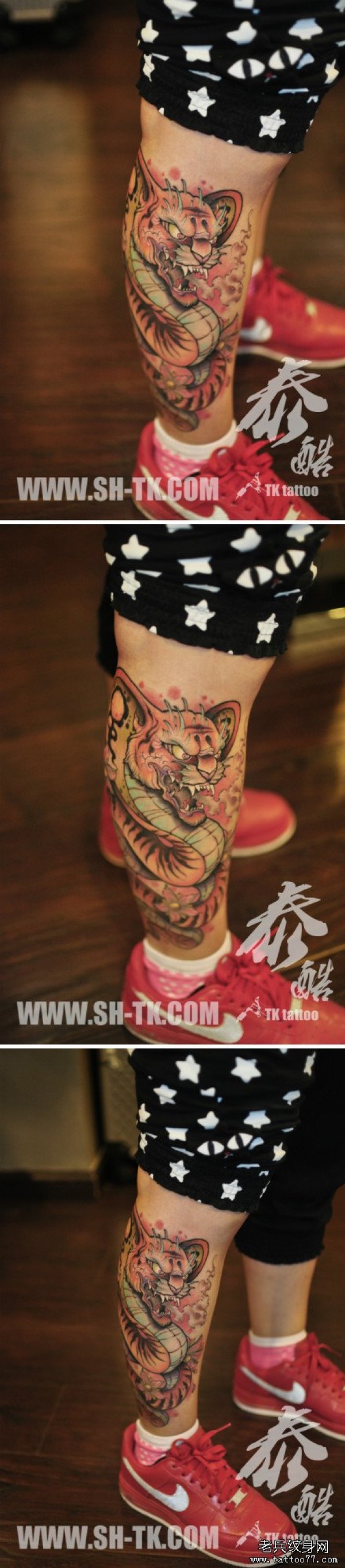腿部超帅的一款老虎头的蛇纹身图案_腿部纹身图案大全_纹身图吧