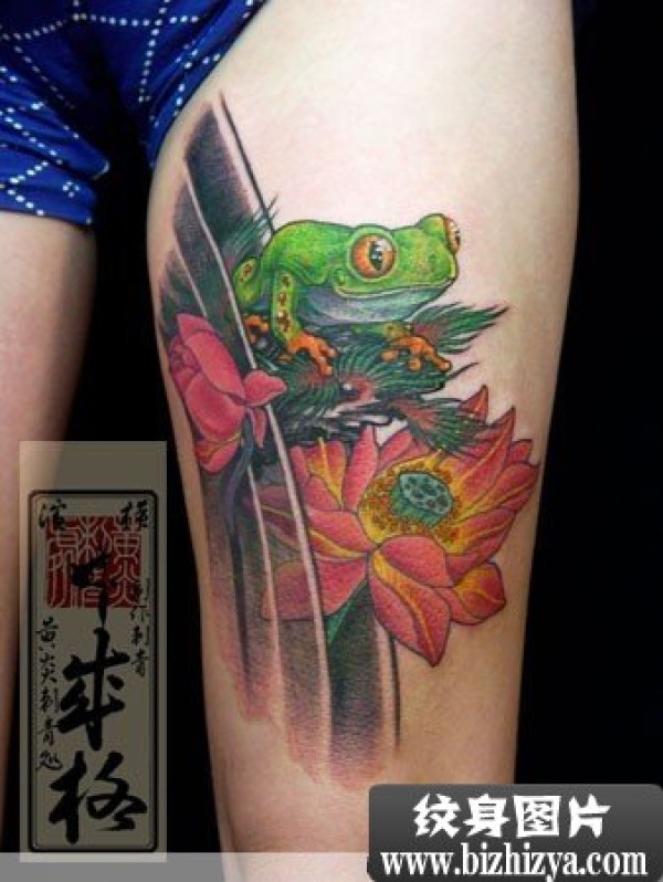 大腿上彩色的青蛙和荷花纹身_腿部纹身图案大全_纹身图吧