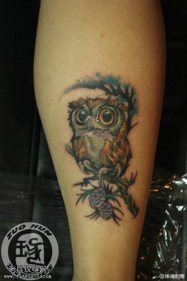 腿部彩色猫头鹰纹身图案_腿部纹身图案大全_纹身图吧