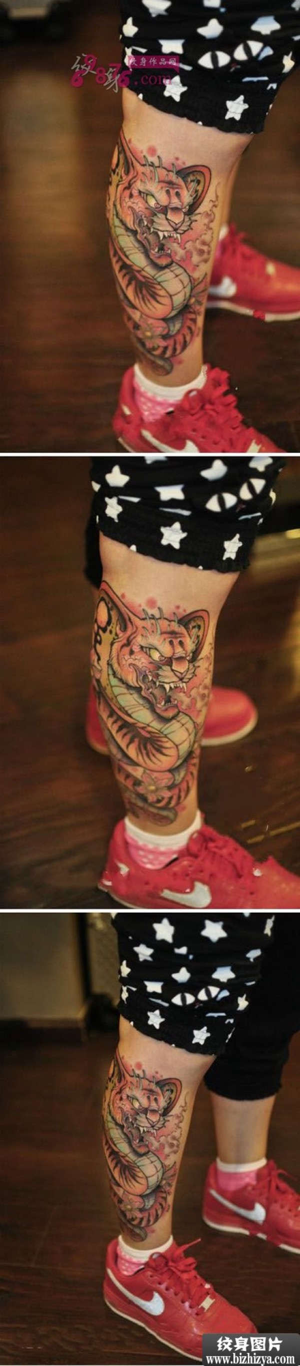 霸气老虎蛇创意花小腿纹身图案图片_腿部纹身图案大全_纹身图吧