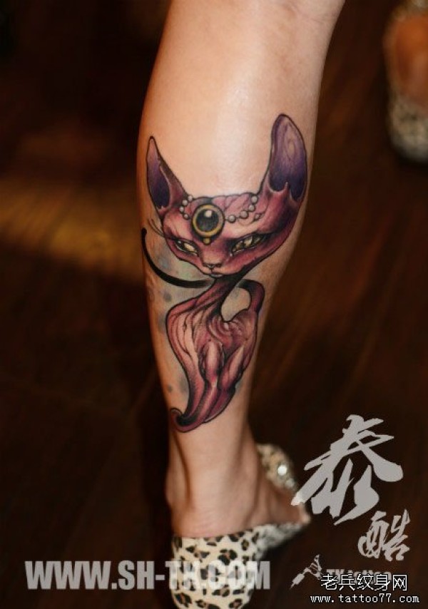 腿部很酷经典的一款猫咪纹身图案_腿部纹身图案大全_纹身图吧