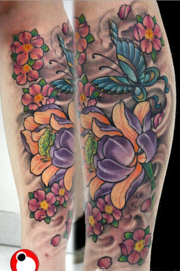 腿部蛇彩色莲花纹身图案_腿部纹身图案大全_纹身图吧