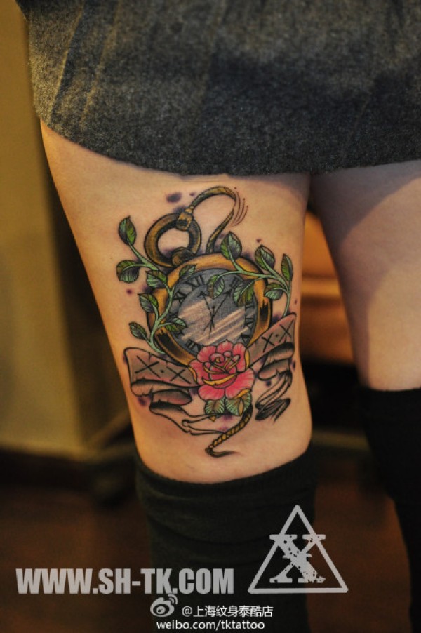 美女腿部潮流精美的怀表纹身图案_腿部纹身图案大全_纹身图吧