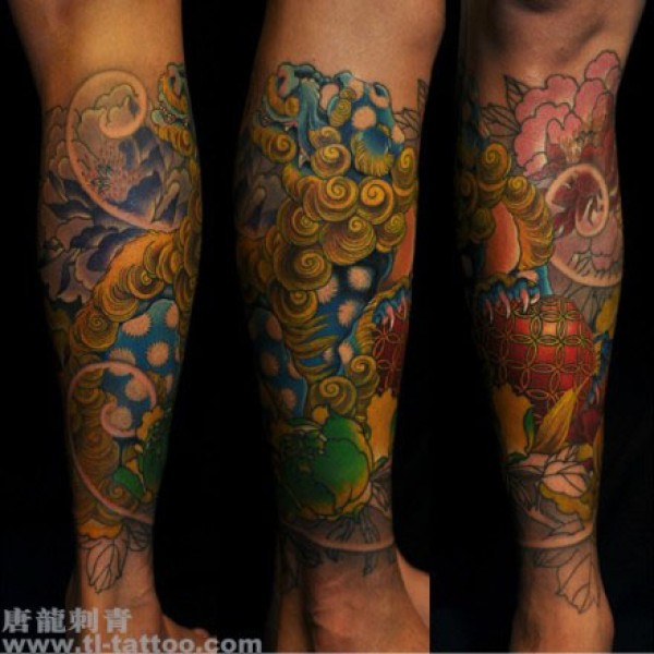 腿部潮流很酷的唐狮子纹身图案_腿部纹身图案大全_纹身图吧