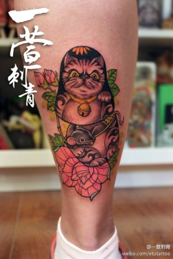 腿部时尚很帅的一款猫咪套娃纹身图案_腿部纹身图案大全_纹身图吧