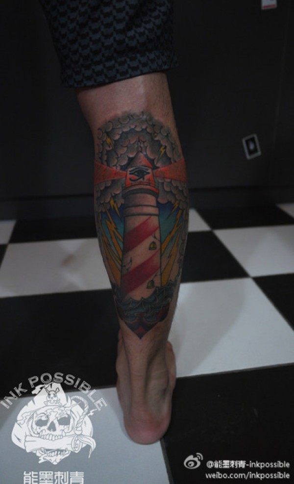 腿部时尚很酷的一款灯塔纹身图案_腿部纹身图案大全_纹身图吧