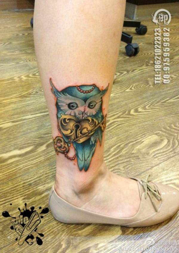 腿部潮流很酷的一款猫头鹰爱心锁与钥匙纹身图_腿部纹身图案大全_纹身图吧