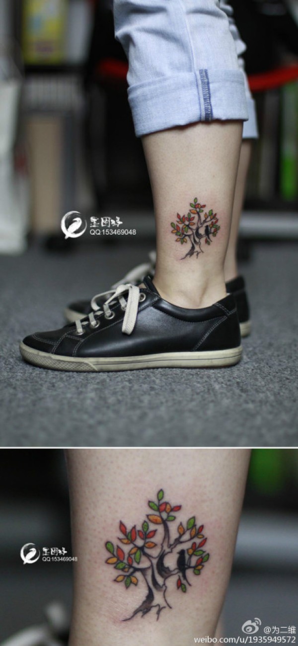腿部小巧时尚的小树与小鸟纹身图案_腿部纹身图案大全_纹身图吧
