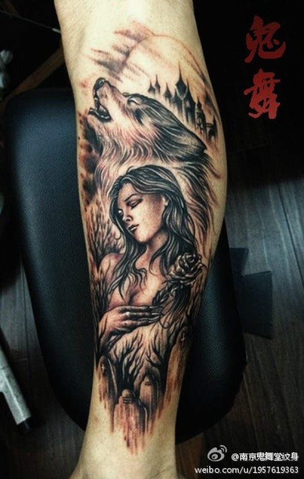 腿部很酷漂亮的狼女纹身图案_腿部纹身图案大全_纹身图吧