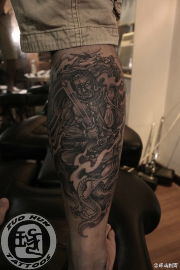 腿部很酷帅气的不动明王纹身图案_腿部纹身图案大全_纹身图吧