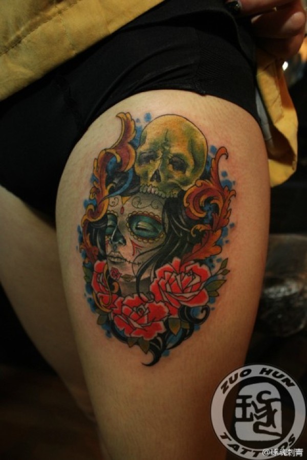 腿部时尚潮流的亡灵装美女纹身图案_腿部纹身图案大全_纹身图吧