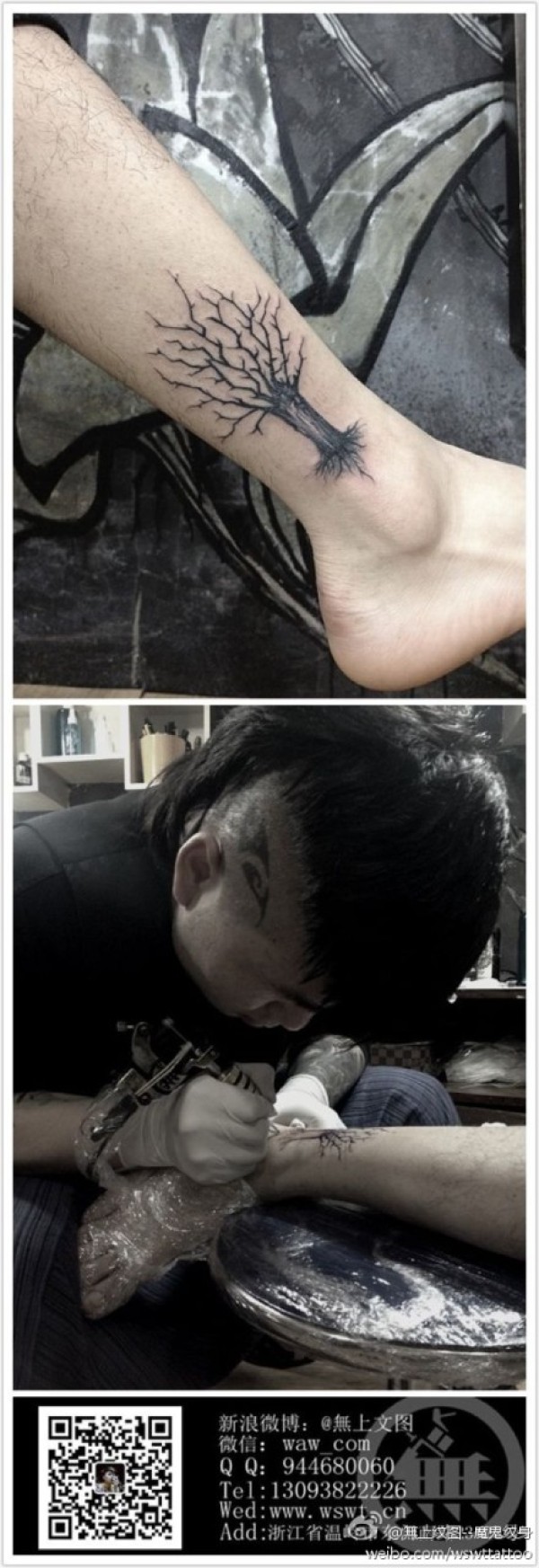 腿部一款潮流经典的黑灰小树纹身图案_腿部纹身图案大全_纹身图吧