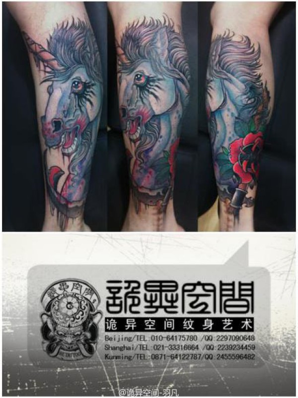男生腿部潮流很酷的独角兽纹身图案_腿部纹身图案大全_纹身图吧