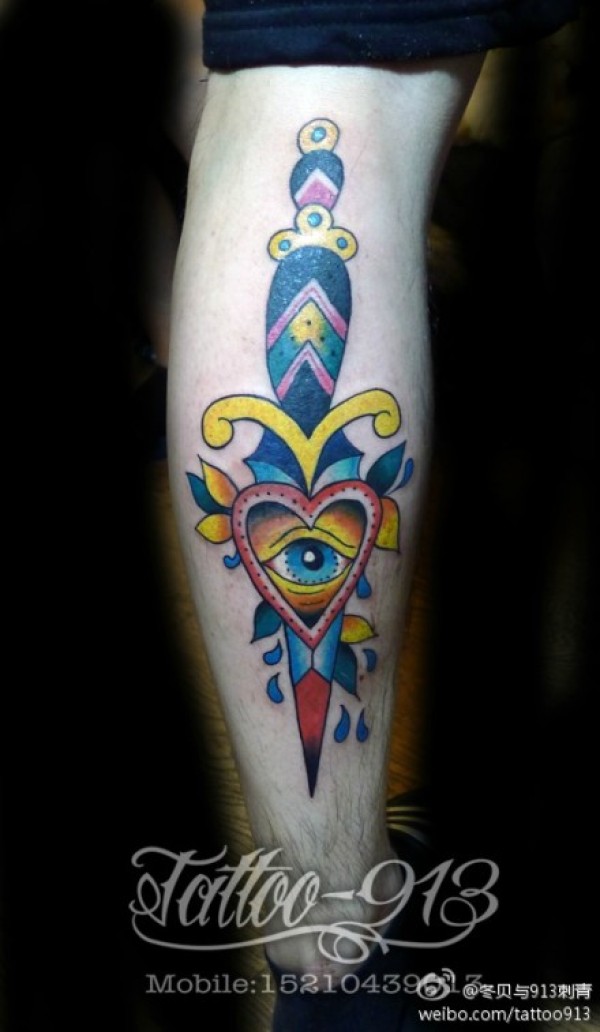 腿部时尚经典的一款匕首与眼睛纹身图案_腿部纹身图案大全_纹身图吧