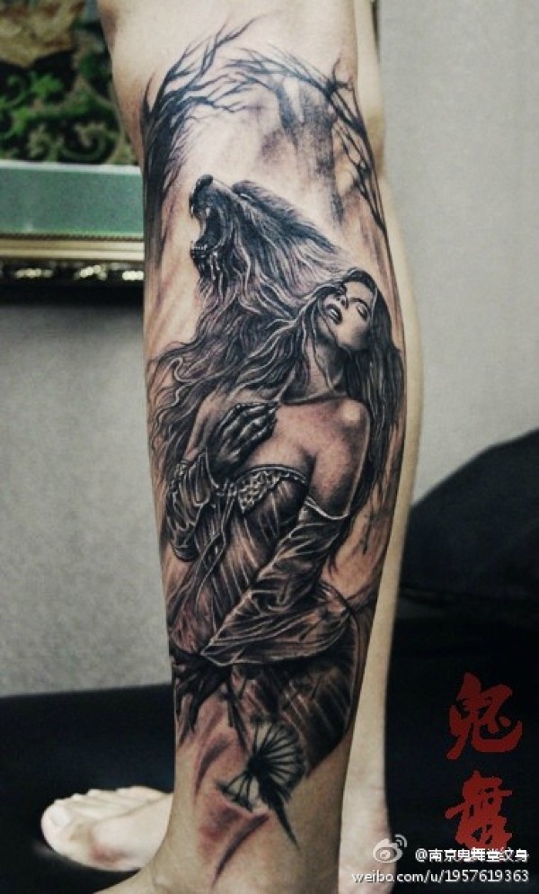 腿部一款很酷漂亮的狼人美女纹身图案_腿部纹身图案大全_纹身图吧