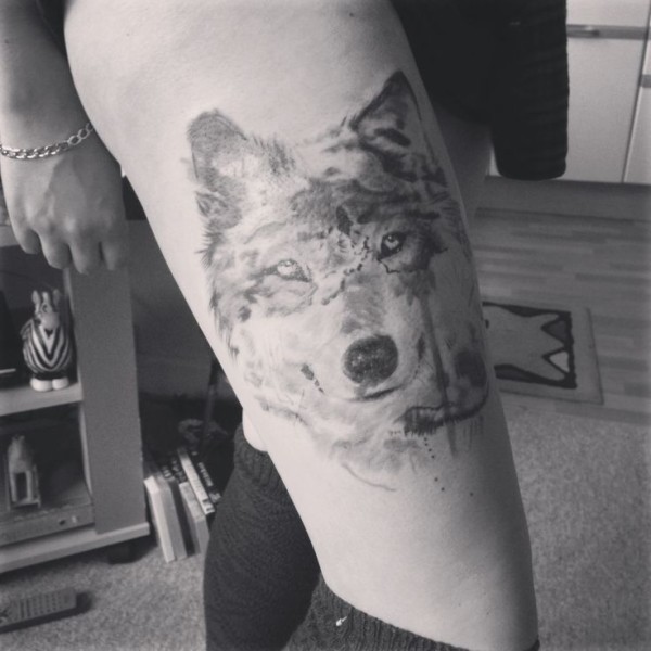推荐一款时尚的腿部水墨狼头纹身图案_腿部纹身图案大全_纹身图吧