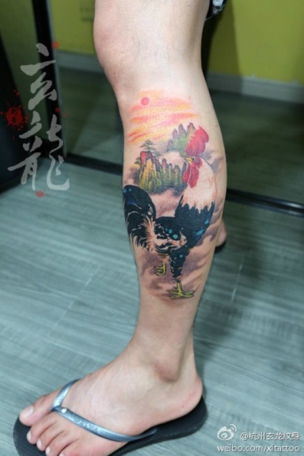 腿部经典的一款公鸡纹身图案_腿部纹身图案大全_纹身图吧