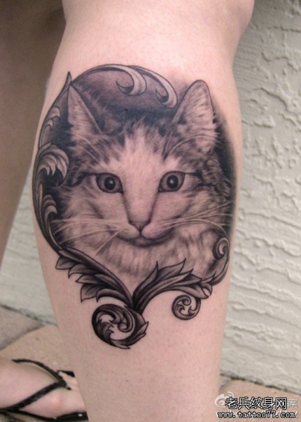 腿部潮流的一款黑灰素描猫咪纹身图案_腿部纹身图案大全_纹身图吧