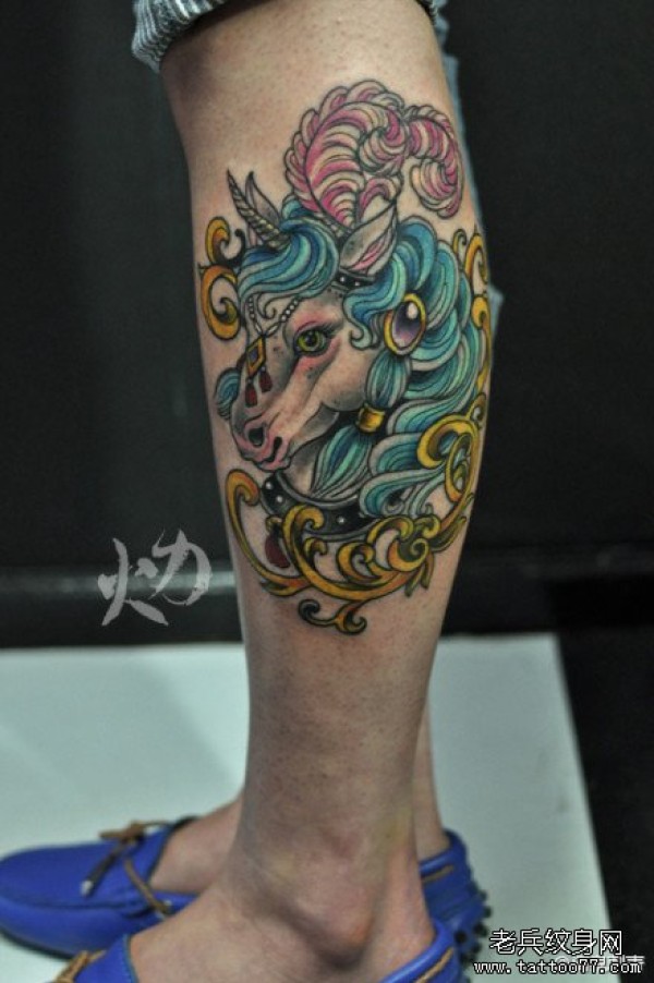 腿部潮流精美的彩色独角兽纹身图案_腿部纹身图案大全_纹身图吧