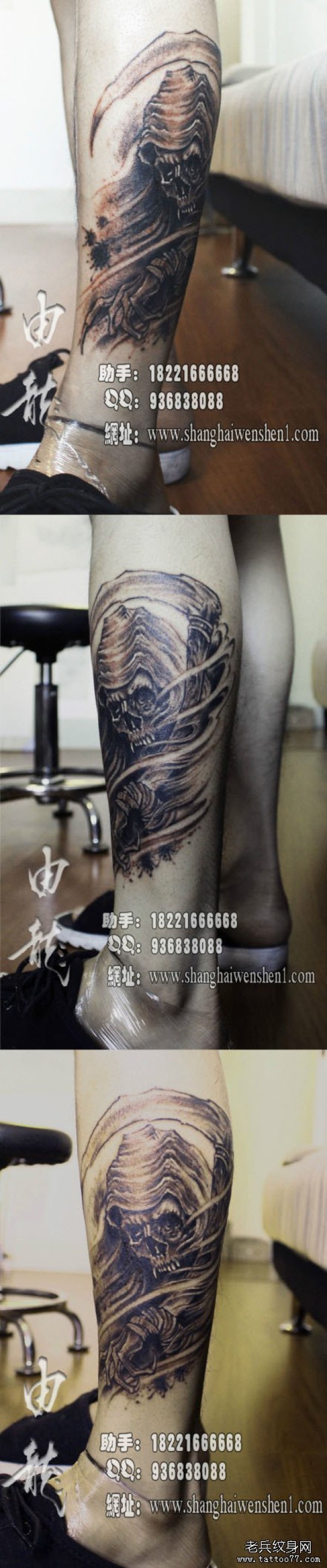 男人腿部超酷帅气的黑灰死神纹身图案_腿部纹身图案大全_纹身图吧