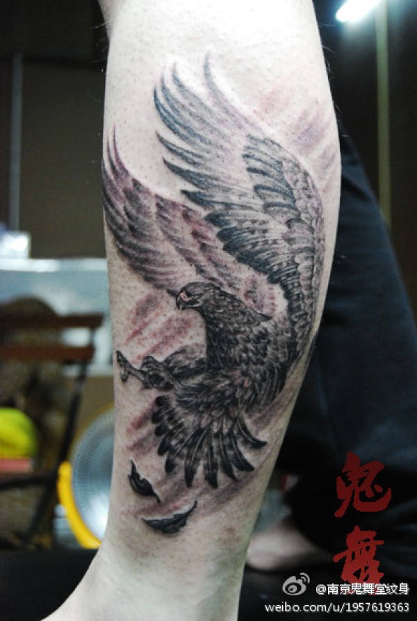 男人腿部超酷经典的黑灰老鹰纹身图案_腿部纹身图案大全_纹身图吧