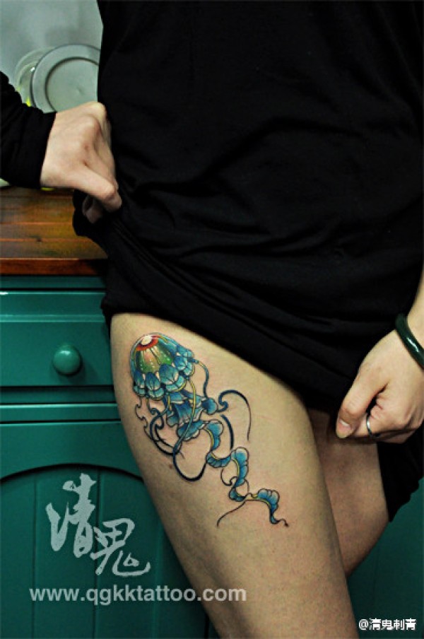 美女腿部时尚精美的水母纹身图案_腿部纹身图案大全_纹身图吧