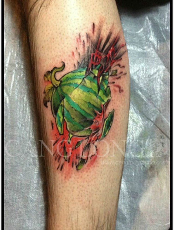 腿部一款击破的西瓜纹身图案_腿部纹身图案大全_纹身图吧