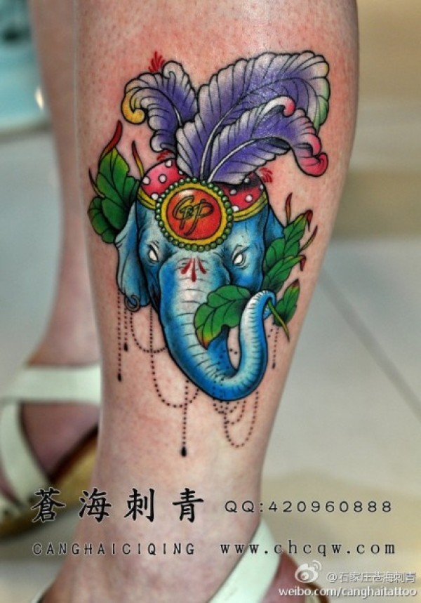 腿部潮流经典的彩色大象纹身图案_腿部纹身图案大全_纹身图吧