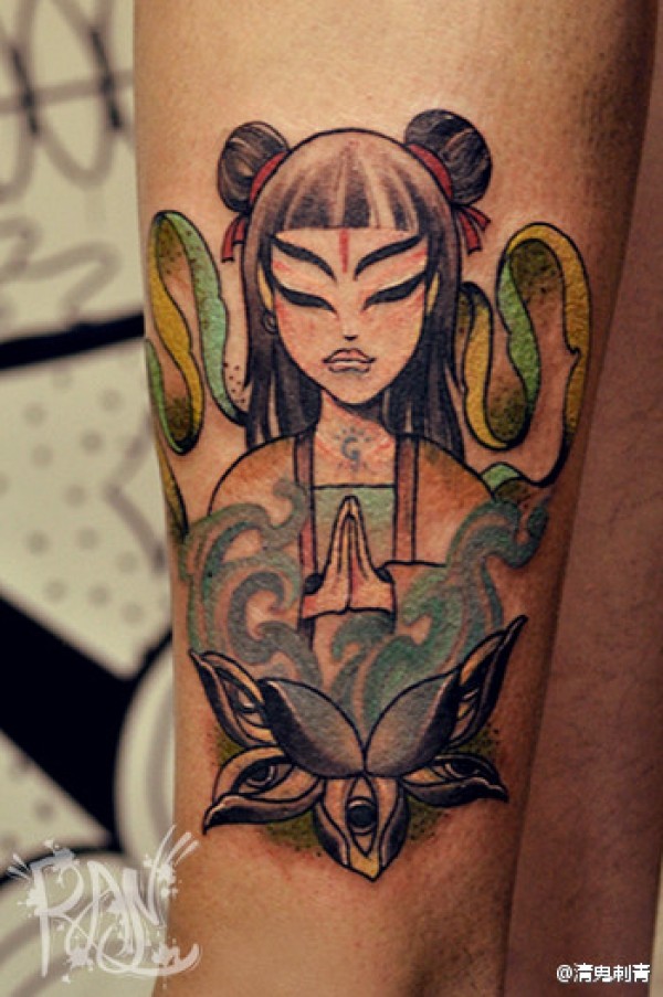 腿部蛇彩色莲花纹身图案_腿部纹身图案大全_纹身图吧