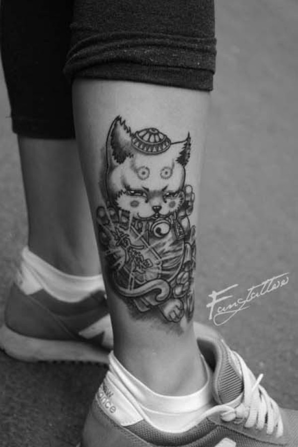 腿部可爱潮流的一款招财猫纹身图案_腿部纹身图案大全_纹身图吧