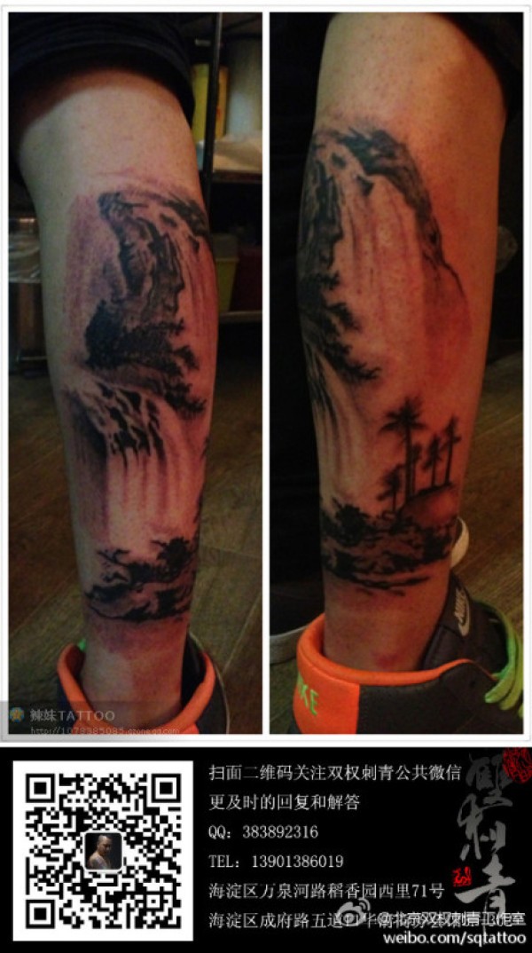 男人腿部超酷经典的黑灰山水画纹身图案_腿部纹身图案大全_纹身图吧