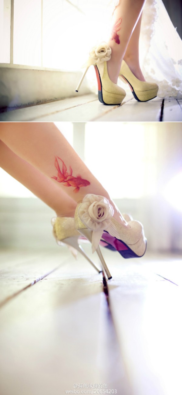 美女腿部漂亮时尚的彩色小金鱼纹身图案_腿部纹身图案大全_纹身图吧