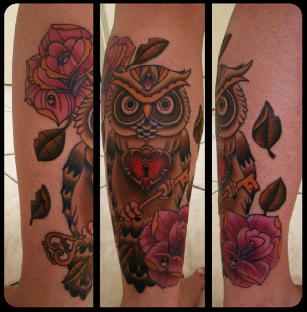 男人腿部经典时尚的猫头鹰纹身图案_腿部纹身图案大全_纹身图吧