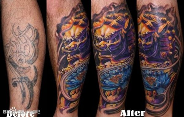 男人腿部帅气经典的彩色石狮子纹身图案_腿部纹身图案大全_纹身图吧