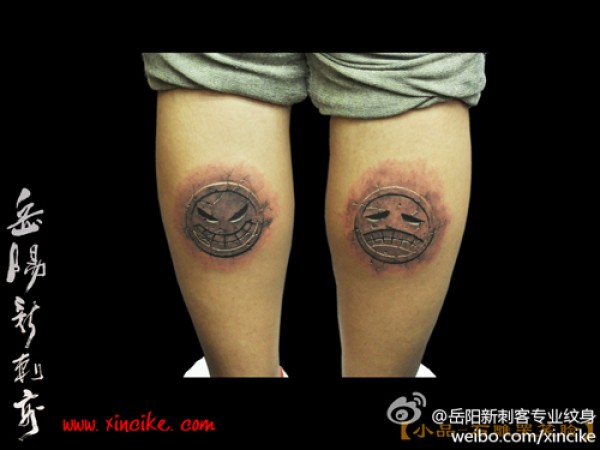 腿部石雕可哭脸与笑脸纹身图案_腿部纹身图案大全_纹身图吧