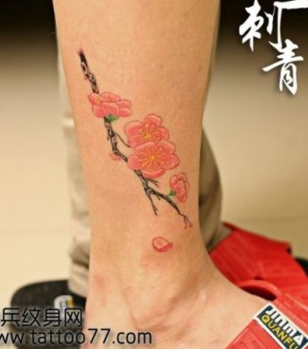 美女腿部彩色桃花纹身图案_腿部纹身图案大全_纹身图吧