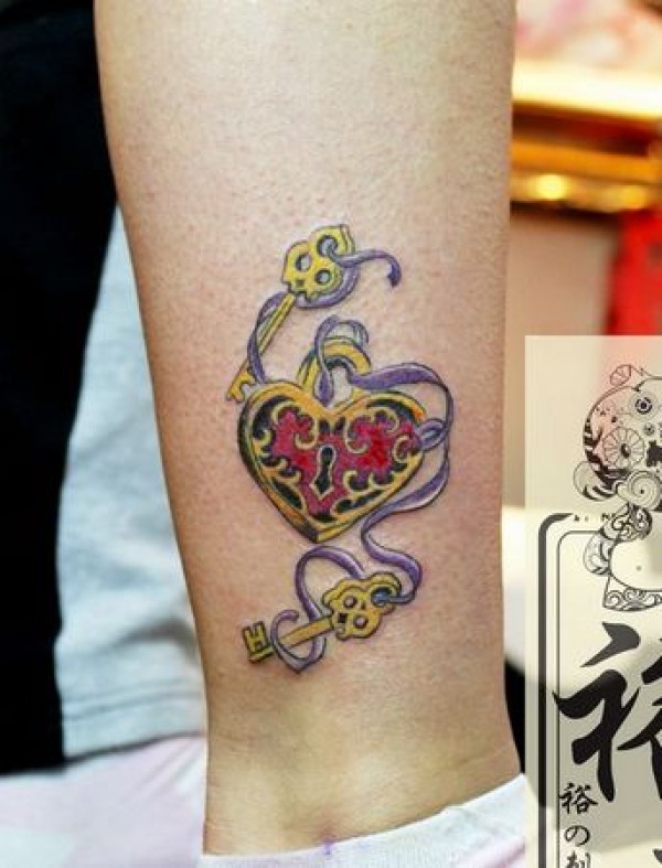 腿部彩色爱心锁钥匙纹身图案_腿部纹身图案大全_纹身图吧