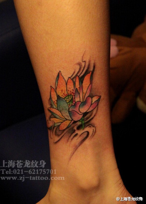 女孩子腿部好看的彩色莲花纹身图案_腿部纹身图案大全_纹身图吧