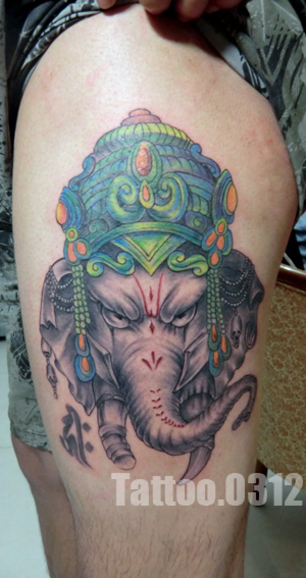一款腿部经典的象神纹身图案_腿部纹身图案大全_纹身图吧