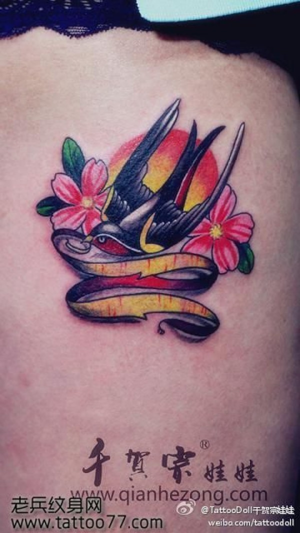 美女腿部彩色燕子樱花纹身图案_腿部纹身图案大全_纹身图吧