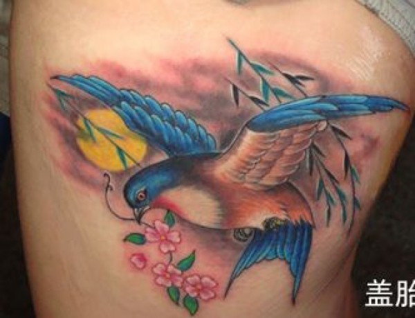 腿部纹身腿部彩色小燕子樱花纹身图案_腿部纹身图案大全_纹身图吧